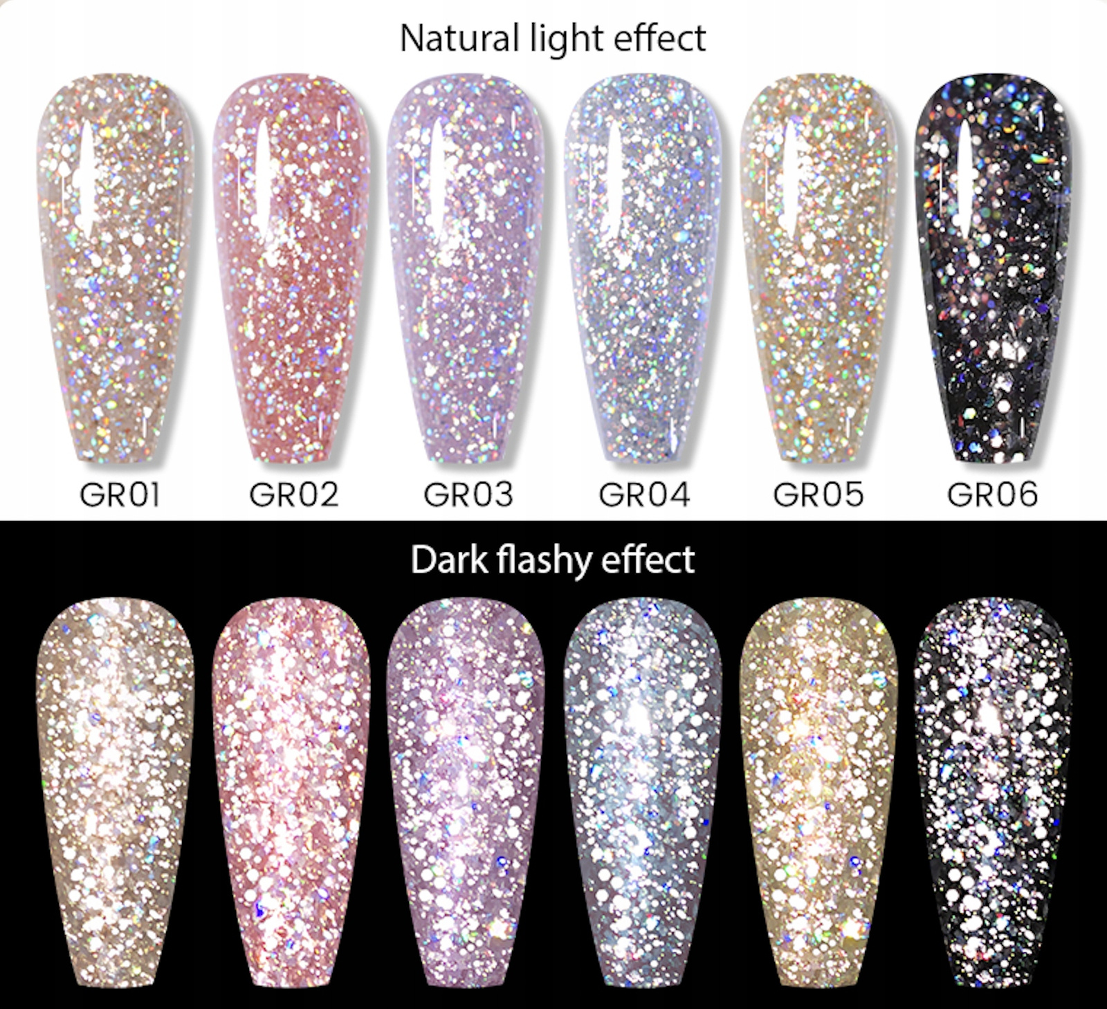 Odkryj niezwykły efekt! W naturalnym świetle żel tworzy delikatny, połyskujący efekt, a pod lampą błyska niczym tysiące drobnych diamentów!