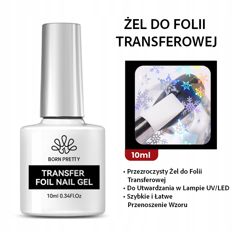 Żel do folii transferowej BORN PRETTY to niezawodny produkt, który umożliwia łatwe i precyzyjne przenoszenie wzorów z folii na paznokcie. Dzięki swojej doskonałej formule sprawia, że zdobienia są trwałe, intensywne i niezwykle efektowne.