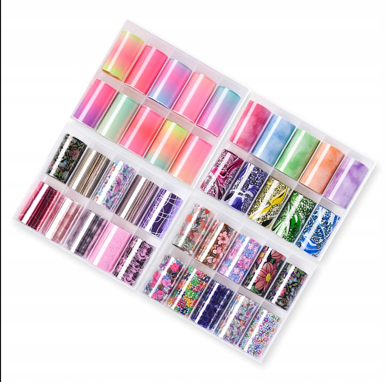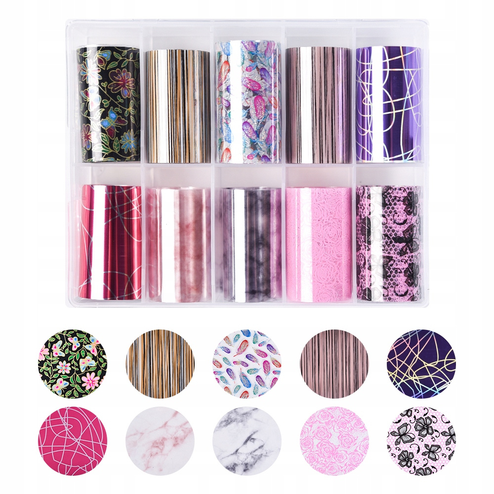 Zestaw dotyczy 10 sztuk różnorodnych wzorów folii w opakowaniu (patrz pierwsze zdjęcie).