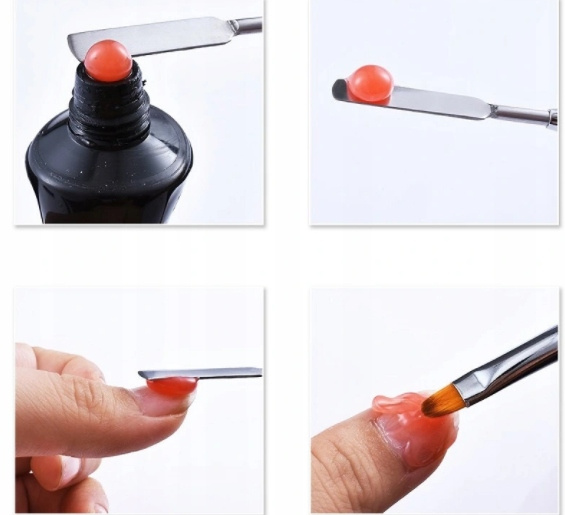 - Syntetyczny pędzel - ułatwia rozciągnięcie akrylożelu na płytce paznokcia i zbudowanie odpowiedniego kształtu. Zbite i właściwie ścięte włosie nadaje się do rozprowadzania produktu.